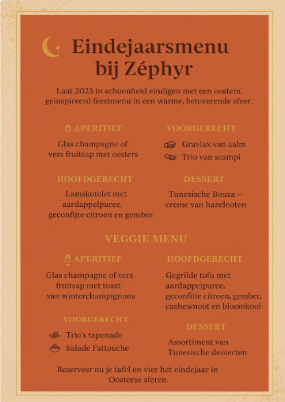 Enjoy an oriental festive menu in a warm and enchanting atmosphere.